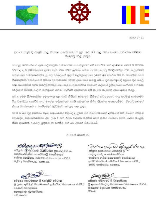 එමෙන්ම මේ මොහොතේ රටේ නීථියට අවනතව නීතියේ ආධිපත්යයට ගරු කරමින් සාමකාමීව සිය විරෝධය දැක්වීඹ හැර මහජන දේපළවලට හානි පමුණුවන කිසිදු ක්රියාවක නොයෙදීමට විරෝධතාවයේ නිතර මහජනතාව වගකීමෙන් බුද්ධිමත්ව කටයුතු කළ යුතු බව මහනාහිමිවරු පෙන්වා දෙයි.
