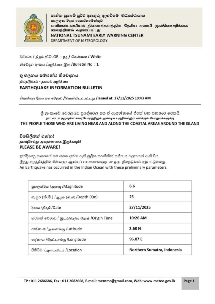 නිවේදනයක් නිකුත් කරමින්, ජාතික සුනාමි පූර්ව අනතුරු ඇඟවීම් මධ්යස්ථානය නිවේදනය කරන්නේ, ශ්රී ලංකාවේ වෙරළබඩ ප්රදේශවල සහ ඒ ආසන්නයේ ජීවත් වන ජනතාවට මේ සම්බන්ධයෙන් විමසිලිමත්ව සිටින ලෙසය.