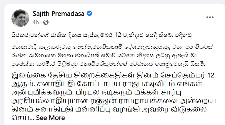 අධිකරණයට අපහාස කිරීමේ චෝදනාව යටතේ වසර 4ක කාලයක සිර දඬුවමට යටත් කර සිටින සමගි ජන බලවේගය පක්ෂයේ හිටපු පාර්ලිමේන්තු මන්ත්රී රන්ජන් රාමනායක මහතා එළඹෙන සැප්තැම්බර් 12 වැනිදා ලෝක සිරකරු දිනය දා නිදහස් කරනු ඇති බව විපක්ෂ නායක සජිත් ප්රේමදාස මහතා සිය නිල ෆේස්බුක් පිටුවේ සටහනක් තබමින් දැනුම් දී තිබෙනවා.