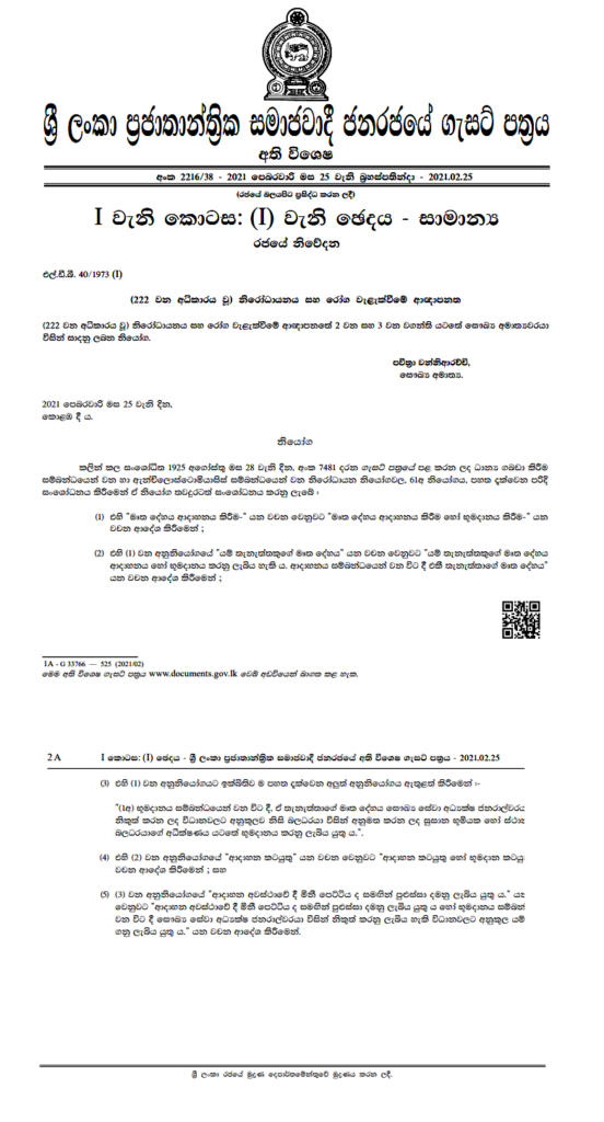කොරෝනා ආසාදිතව මිය යන පුද්ගලයන්ගේ මෘත දේහ භූමදානයට අනුමැතිය ලබා දීමේ ගැසට් නිවේදනය ඊයේ මධ්යම රාත්රියේ නිකුත් කර තිබෙනවා.