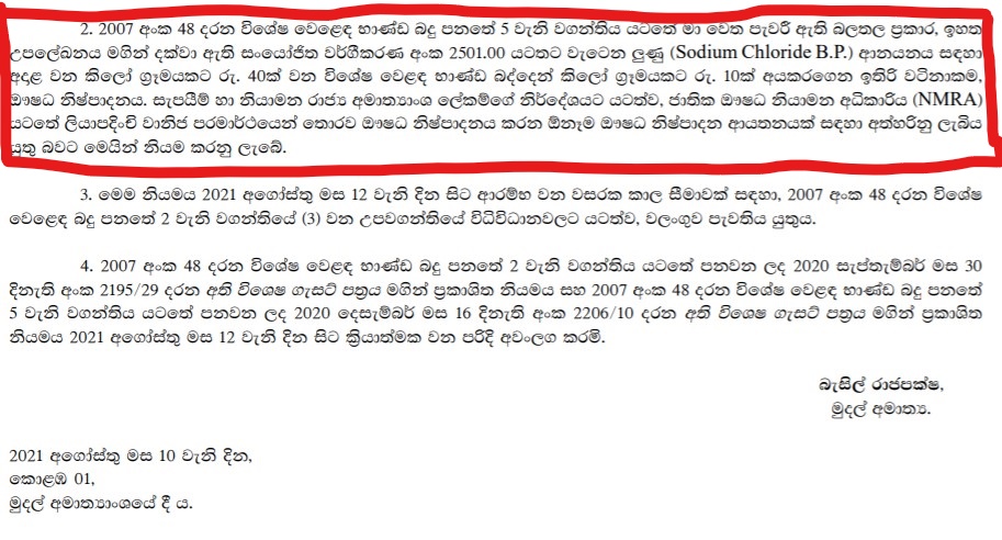 එමෙන්ම ලුණු සඳහා අයකරන බද්දෙන් රුපියල් දහයක් පමණක් රජය සතුව තබා ගැනීමටත් ඉතිරි රුපියල් ජාතික ඖෂධ නියාමන අධිකාරිය යටතේ ලියාපදිංචි කොට ඇති ලාභ ඉපයීම අරමුණු කර නොගත් ආයතනයක් වෙත ලබාදීම සඳහා අත් හරින බවයි බැසිල් රාජපක්ෂ මහතා නිකුත් කළ විශේෂ ගැසට් නිවේදනයේ දැක්වෙන්නේ.