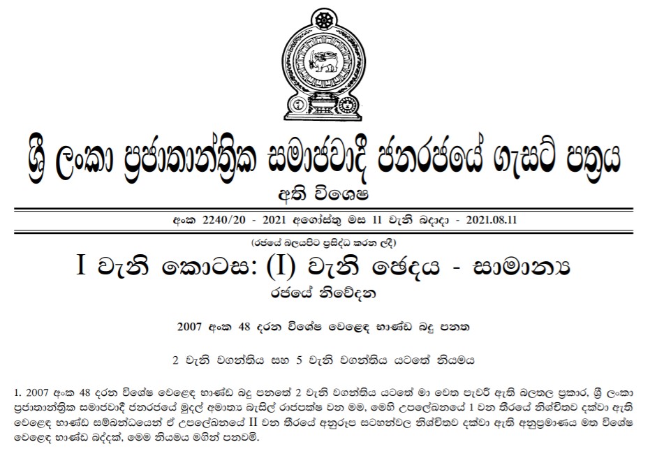 මුදල් අමාත්ය බැසිල් රාජපක්ෂ මහතා විසින් විශේෂ ගැසට් නිවේදනයක් නිකුත් කර තිබෙනවා.