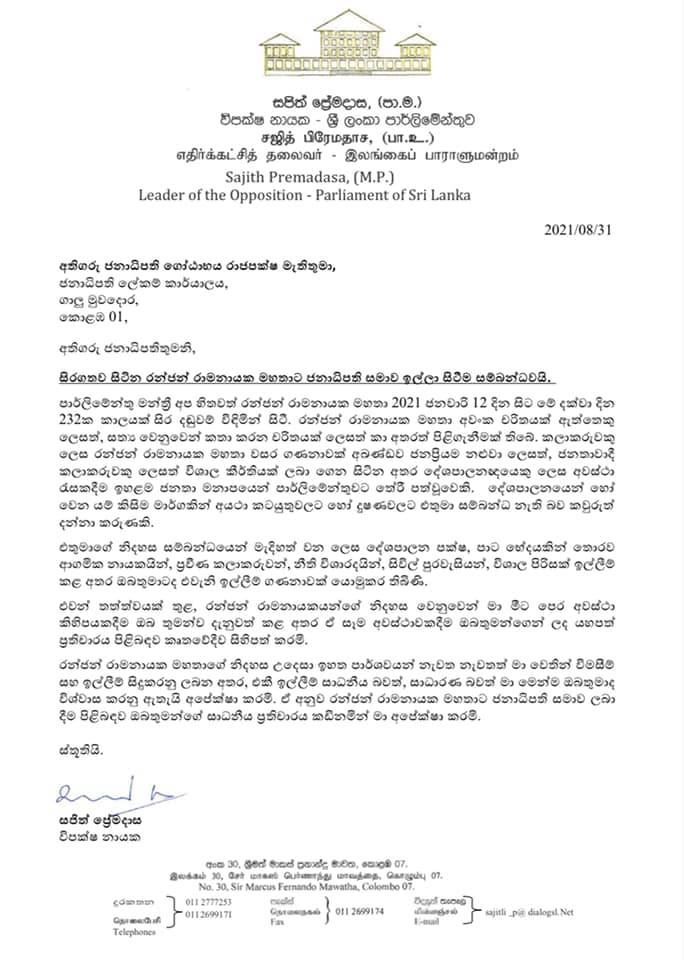 අධිකරණයට අපහාස කිරීමේ චෝදනාව යටතේ වසර 4ක කාලයක් සඳහා සිර දඬුවමට යටත් කර සිටින සමගි ජන බලවේගය පක්ෂයේ හිටපු පාර්ලිමේන්තු මන්ත්රී රන්ජන් රාමනායක මහතාට ජනාධිපති සමාව යටතේ නිදහස ලබා දෙන්නැයි ඉල්ලා විපක්ෂ නායක සජිත් ප්රේමදාස මහතා විසින් ජනාධිපතිවරයා වෙත ලිපියක් යොමු කර තිබෙනවා.