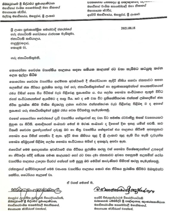 පවතින තත්ත්වය පිළිබඳව අවධානය යොමු කොට විශේෂඥ උපදෙස් අනුව යමින් සතියක පමණ කාලයකට හෝ රට වසා දමන ලෙස සියම් නිකායේ මල්වතු සහ අස්ගිරි පාර්ශව වල මහනායක හිමිවරුන් ජනපතිවරයා වෙත ඒකාබද්ධ ලිපියක් යොමු කර තිබෙනවා.